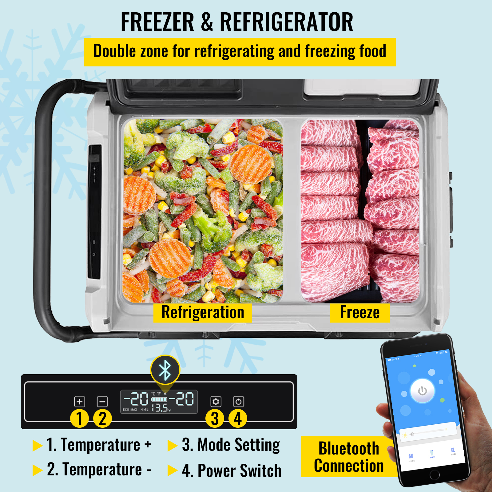 This superior portable car refrigerator has a modern appearance with a simple black and silver color assortment. A compact design, dual-zone and temperature control, battery protection and two power cables are ideal for indoor and outdoor fridge use—the perfect choice for you to enjoy fresh food and cold drinks at home or on the journey.